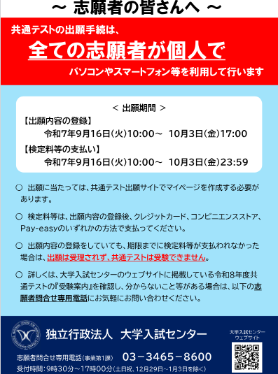 【教務連絡】大学入試センターからのお知らせ 事務連絡 2025.09.18 共通テストの申し込み方法が今年度から変更になりました。 すべての志願者が、携帯やスマートフォンで、自身で行うようになりました。 チラシはこちら。
